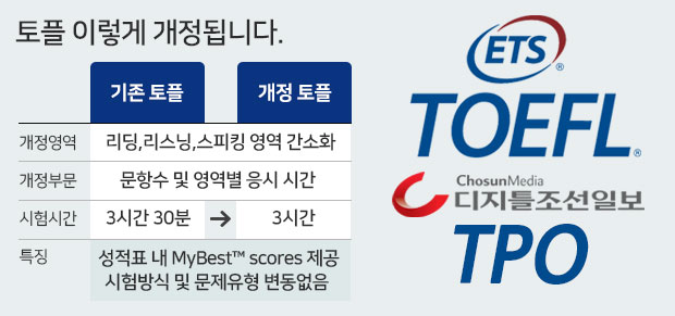 이에 디지틀조선일보는 8월 개정되는 토플 시험에 대비할 수 있도록 ETS 공식 토플모의고사 ‘TOEFL Practice Online’을 6월 4일부터 서비스 한다. TOEFL Practice Online은 토플 주관사인 ETS가 개발한 유일한 공식 토플모의고사로 자세한 사항은 ETS 홈페이지에서 확인할 수 있다.