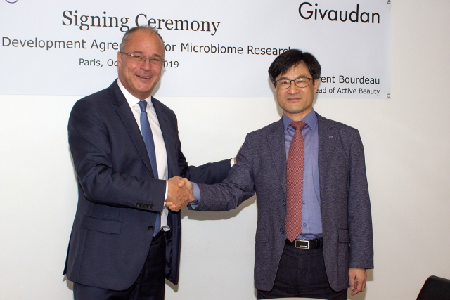 아모레퍼시픽이 지난 4일(현지시간) 프랑스 아르장퇴유에 위치한 지보단의 유럽 크리에이티브 센터에서 기능성 원료 업체 '지보단'과 피부 미생물 공동연구 프로젝트를 위한 협약을 체결했다고 7일 밝혔다.