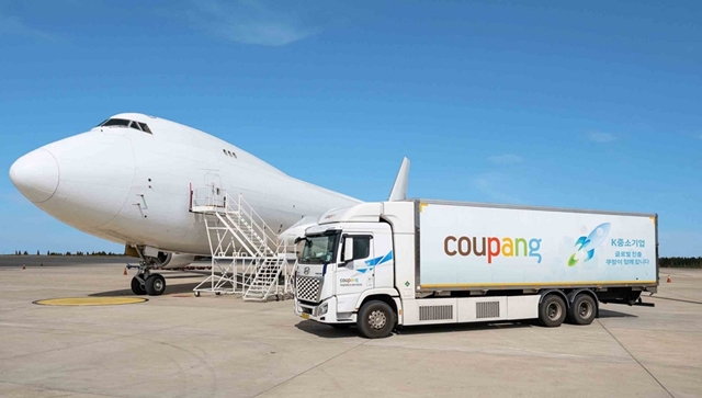 대만행 비행기 앞에 서 있는 쿠팡 배송 차량 /쿠팡 제공