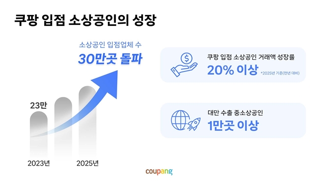 1일 쿠팡은 입점 소상공인 기업 수가 지난해 말 기준 30만 곳을 넘어섰다고 밝혔다. 로켓배송·로켓프레시·로켓그로스·마켓플레이스에 입점한 소상공인 수치다. 소상공인 입점업체 수는 지난 2023년 약 23만곳에서 꾸준한 증가세를 보이며 지난해 30만곳 고지를 넘어섰다. 2년 간 쿠팡과 손을 잡은 소상공인이 30% 늘어난 것이다. 현재 쿠팡에 입점한 소상공인 10곳 중 7곳 이상이 경상·전라·충청·강원도 등 지역에 포진해 있다. 이들 소상공인들의 지난해 거래액은 전년 대비 20% 이상 성장했다. 같은 기간 전국 소상공인의 평균 성장률(0.2%·한국신용데이터)과 비교해 높은 성장세를 보였다.