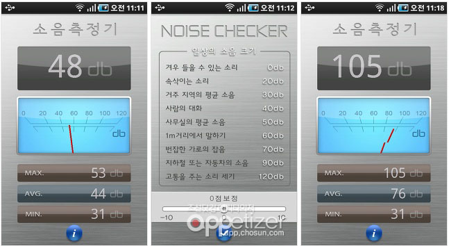 소음측정기를 이용해 주변의 소음을 체크해 보세요. i를 터치하면 일상적인 소음의 기준을 볼 수 있습니다. 제가 사무실에서 확인해보니 56db 정도가 나오더라구요. 사무실의 평균소음쯤 되는구나라고 여겨지더군요. 혹시 소리가 큰데도 소음측정기가 제대로 작동하지 않는다면 0점보정을 이용해서 맞춰보세요. 크게 고함을 지르니 105db까지 올라가더군요.