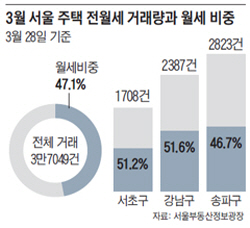 지역별로는 강남 3구의 월세 거래가 빠르게 늘고 있다. 지난해 3월 41.8%에서 이달엔 49.5%로 절반에 육박했다. 강남구(51.6%), 서초구(51.2%), 송파구(46.7%) 모두 이달 월세 거래 비중이 역대 최고를 기록했다.