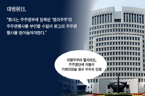 재판부는 지난 23일 자신의 돈으로 주식을 사지 않은 차명주주라도 주주명부에 이름이 기재되어 있을 경우 주주권행사가 가능하다고 판결을 내렸다.