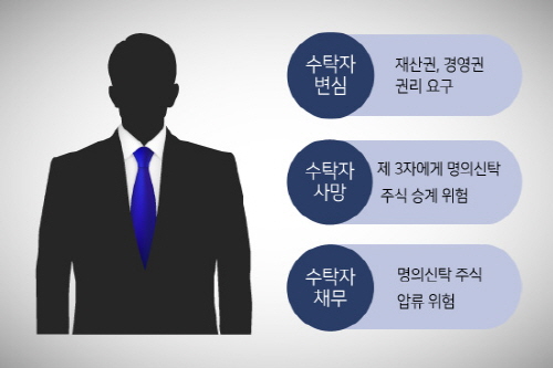 이러한 명의신탁은 다양한 위험요소를 안고 있다. 수탁자의 변심으로 인한 권리행사 위험, 수탁자 사망으로 인한 제 3자 승계 위험, 수탁자의 재정문제로 인한 명의신탁 주식 압류 위험 등이 있다.