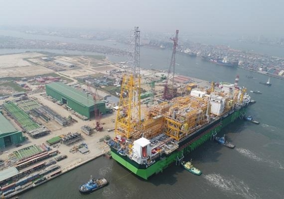 삼성중공업이 건조한 FPSO(부유식 원유생산 저장 및 하역설비)가 2018년 1월 나이지리아 라고스 공장에 입항하고 있다. 사진/삼성중공업