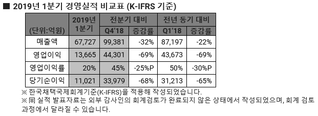SK하이닉스는 1분기 영업이익이 1조3665억원을 기록해 전분기 대비 69% 하락했다고 25일 밝혔다. 매출액은 6조7727억원으로 전분기 보다 32% 감소했으며, 영업이익률은 20% 이다. 순이익은 1조1021억원(순이익률 16%)을 기록했다.
