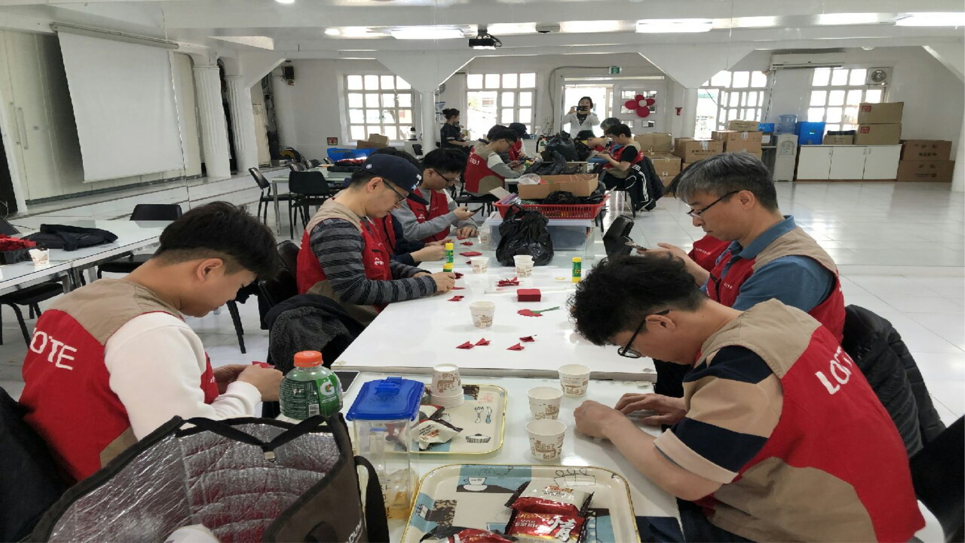 화공/산업플랜트부문 샤롯데봉사단이 다가올 5월 가정의 달을 맞이해 카네이션을 만들어주고 있다 /롯데건설 제공