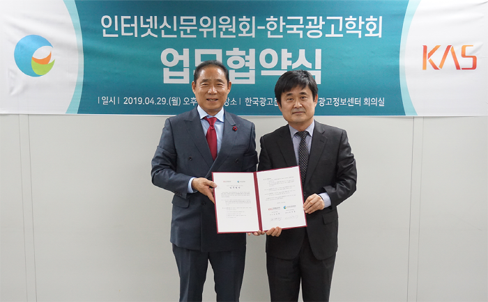 방재홍 인터넷신문위원회 위원장과 김병희 한국광고학회 회장./인신위 제공