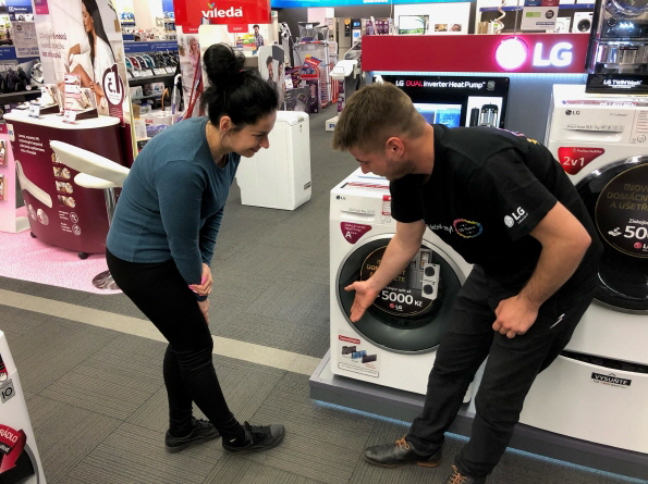 대만의 한 가전매장에서 매장직원이 고객에게 LG 건조기의 차별화된 콘덴서 자동세척시스템을 소개하고 있다./LG전자 제공