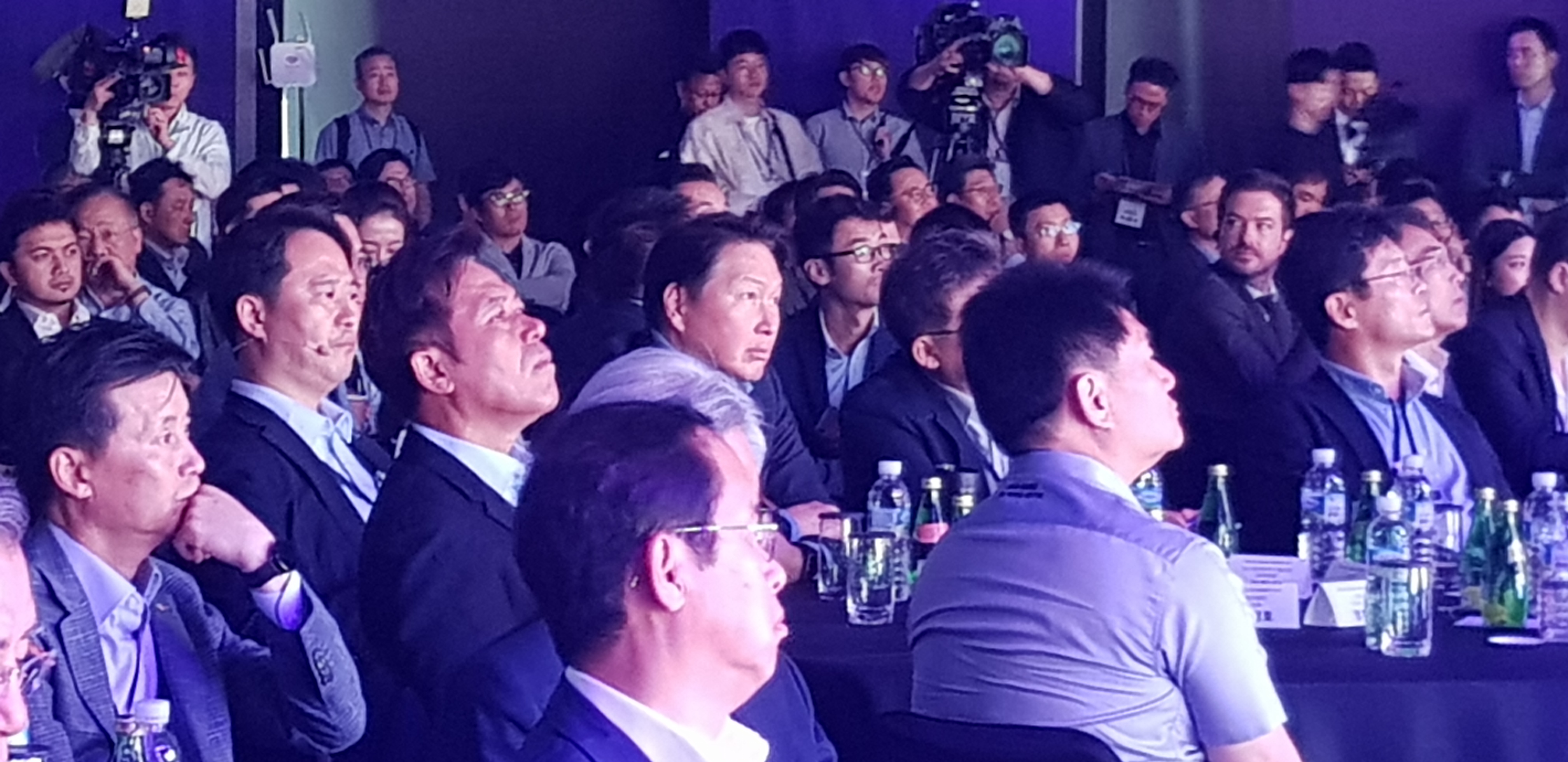 최태원 SK 회장(가운데)과 박정호 SKT 사장(왼쪽 세번째)가 28일 서울 워커힐 호텔에서 열린 2019 소셜밸류커넥트 컨퍼런스에서 기조연설을 경청하고 있다 /사진=정문경 기자