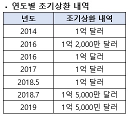 2014년 이래 일곱 차례 총 8억 2천만 달러 조기 상환