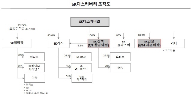 SK디스커버리는 지주회사가 자회사가 아닌 계열회사 지분을 보유할 수 없다는 공정거래법의 지주회사 행위제한 요소를 해소하고 투자자금을 확보코자 SK건설 지분 매각을 결정했다.