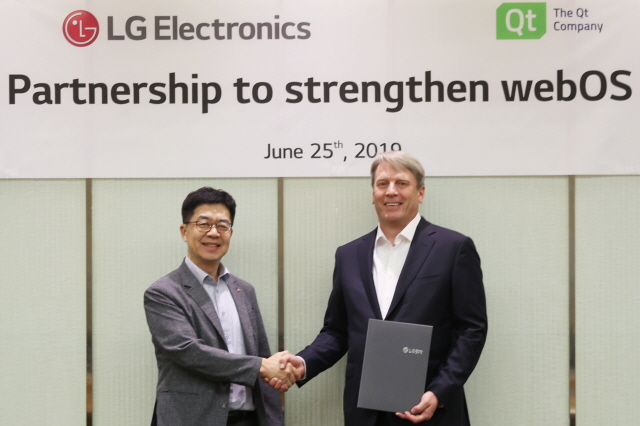 LG전자는 서울 양재동에 위치한 서초R&D캠퍼스에서 박일평 LG전자 사장, 유하 바렐리우스(Juha Varelius) Qt사 CEO 등이 참석한 가운데 'webOS' 연구개발과 관련한 업무협약(MOU)를 전날 체결했다고 26일 밝혔다.