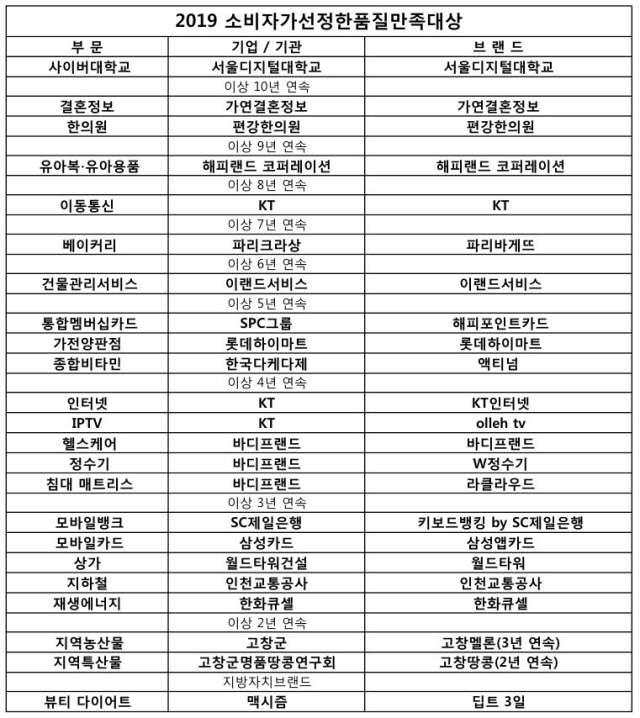 올해로 10회째를 맞은 '2019 소비자가 선정한 품질만족대상'에서 우수한 서비스품질을 인정받은 20개 기업, 23개 브랜드가 발표됐다.