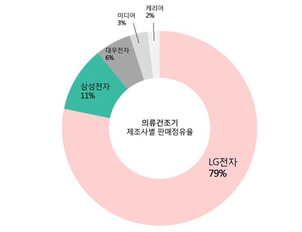 8일 가격비교업체인 다나와에 따르면 국내 의류건조기 제조사별 판매율에서 LG전자가 듀얼인버터와 대용량 기세를 몰아 올해 1월~6월까지 79%의 점유율을 보이며 압도적인 1위 자리를 지켰다.
