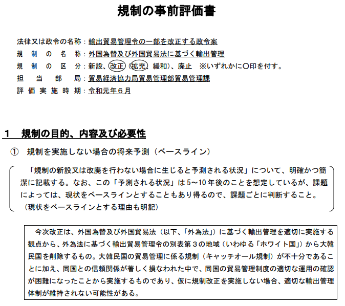일본 전자정부통합창구에 올라온 화이트국가에서 한국을 제외하는 '수출 무역 관리령의 일부를 개정하는 정령 안' 규제평가서./일본경제산업성 갈무리.