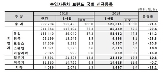 작년 동기 대비 유럽차 브랜드는 29.6% 줄어든 반면 일본차 브랜드는 10.8% 늘었다.
