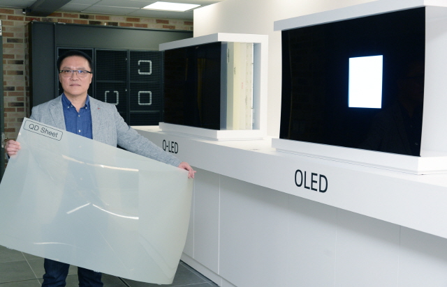 17일 서울 여의도 LG트윈타워에서 열린 LG전자 디스플레이 기술설명회에서 LG전자 HE연구소장 남호준 전무가 패널의 차이를 설명하기 위해 국내시장에 판매중인 QLED TV에 적용된 퀀텀닷 시트를 들고 있다./LG전자제공