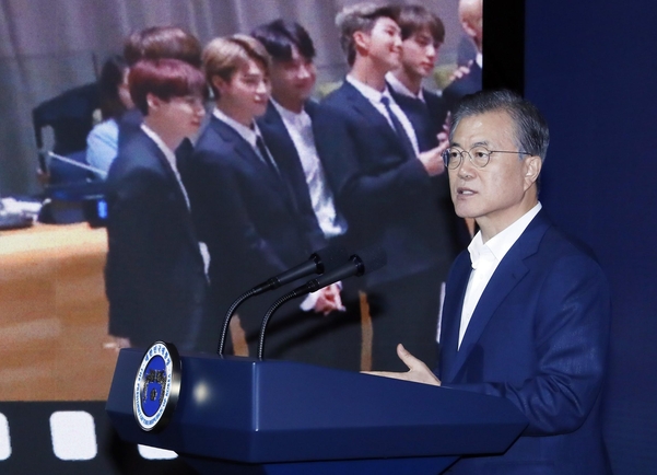 문재인 대통령이 17일 오후 동대문구 콘텐츠인재캠퍼스에서 콘텐츠산업 3대 혁신전략 비전 발표를 하고 있다. /연합