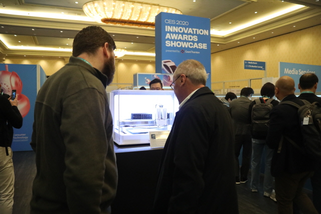 9일 업계에 따르면 CES 테크 웨스트 전시장의 혁신상 수상 제품 쇼케이스은 아모레퍼시픽의 '3D 프린팅 맞춤 마스크팩'을 소개했다.