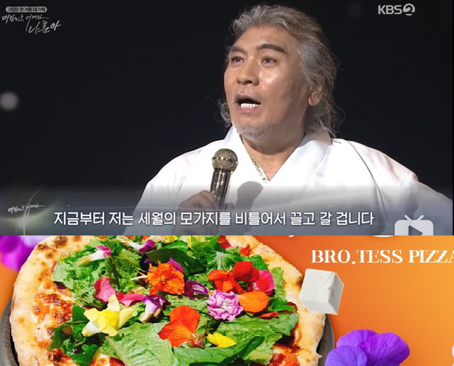 KBS '2020 한가위 대기획 대한민국 어게인 나훈아' 방송영상 캡쳐 화면과 경북 예천군 농업법인 직영 '쌈 라운지앤카페'가 개발한 '테스형피자'. / 경북 예천군 제공