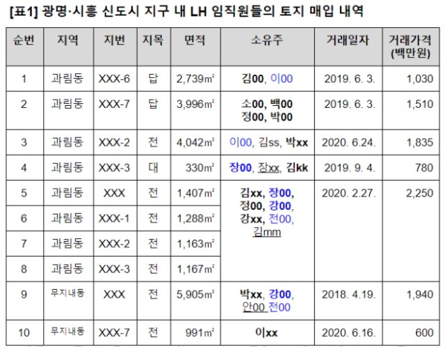 광명·시흥 신도시 지구 내 LH 직원들의 토지 매입 내역/참여연대 제공