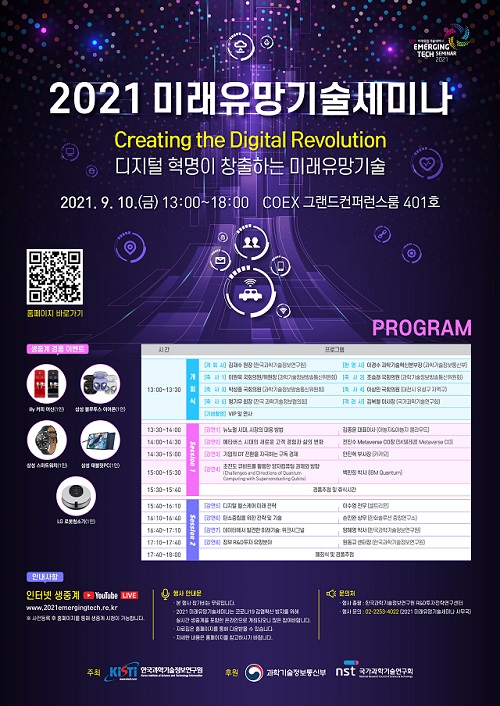 한국과학기술정보연구원(KISTI, 원장 김재수)은 9월 10일 코엑스(COEX) 그랜드컨퍼런스룸에서 디지털 혁명이 창출하는 미래 유망 기술’이라는 주제로 ‘2021 미래유망기술세미나’를 개최한다고 밝혔다.