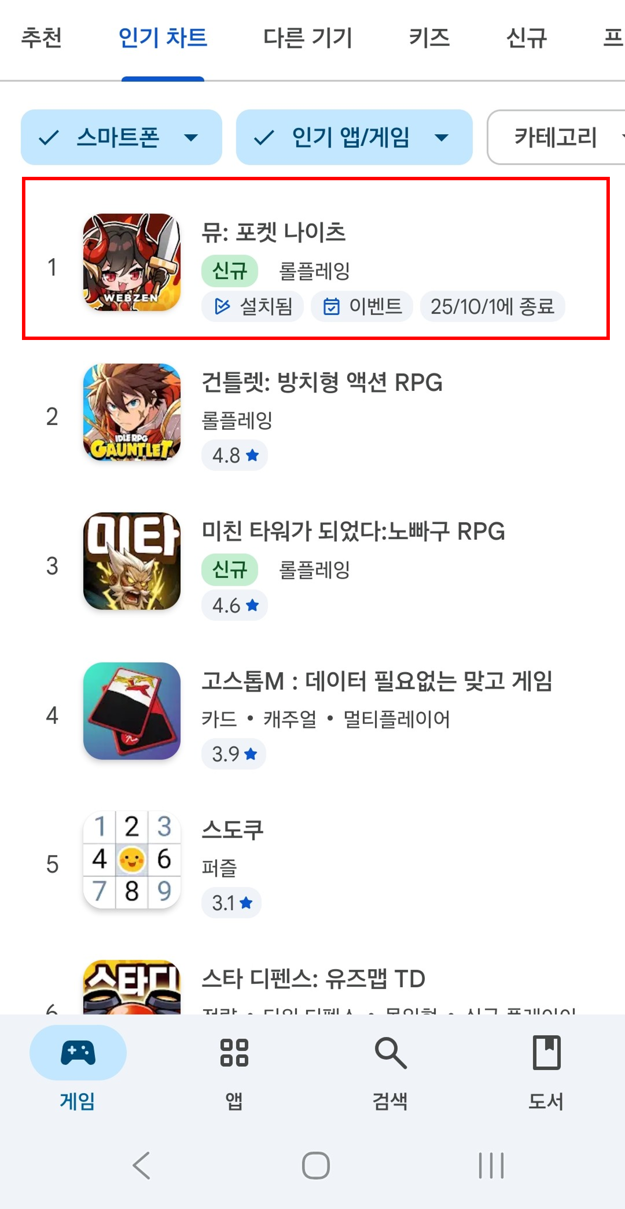웹젠(대표 김태영)의 신작 방치형RPG ‘뮤: 포켓 나이츠’(이하, 포켓 나이츠)가 9월 21일 구글 플레이에서 인기 순위 1위를 기록했다.