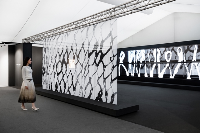 반투명 패브릭과 투명 올레드 TV, 올레드 에보를 나란히 배치해 하나의 작품처럼 구성한 LG전자의 전시 공간. /LG전자 제공