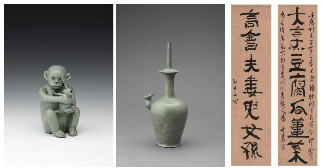 왼쪽부터 <청자모자원숭이형연적>(국보·12세기), <청자상감연지원앙문정병>(국보·12세기), <대팽고회>(추사 김정희·보물) /간송미술문화재단 제공