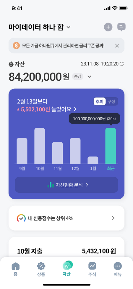 최근 개편을 통해 ‘하나원큐’는 홈 화면에서 총자산과 지출 현황을 한눈에 파악하고, 맞춤형 자산관리로 자연스럽게 이동할 수 있도록 했다. 기존 마이데이터 서비스 ‘하나 합’을 통합해 사용자는 여러 기관의 금융 정보를 하나의 화면에서 관리할 수 있게 되었으며, 데이터 조회 속도와 편의성도 대폭 향상됐다.