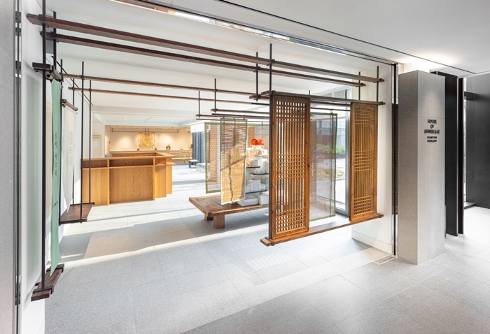 실제 한옥에 사용되었던 문과 평상으로 조성한 ‘전시장 입구’는 조대용 장인의 대나무 발 등 전통적 요소를 더해 한옥의 문턱을 표현했다. 전시 주제와 시기에 맞춘 전통 직물을 함께 설치해, 입구라는 공간에 상징성과 계절감을 더했다.