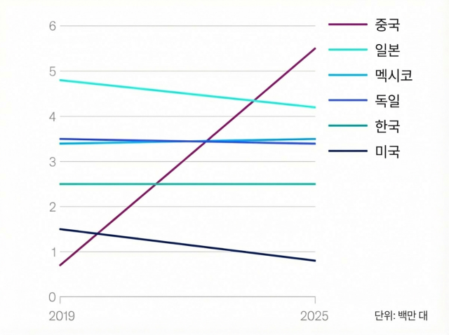 20년 넘게 1위를 지켜온 일본차는 약 2500만대 판매에 그치며 왕좌를 내줬다. 일본차는 2018년을 정점으로 내리막길을 걷기 시작했고, 2022년만 해도 800만대나 앞섰던 중국과의 격차가 불과 3년 만에 뒤집혔다.