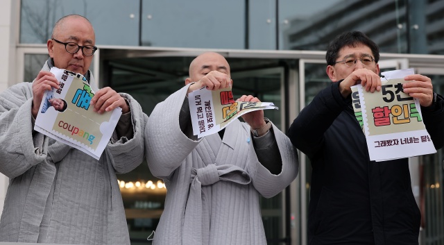 안전한 쿠팡 만들기 공동행동 관계자들이 쿠팡 본사 앞에서 열린 시민 기만하는 쿠팡 탈퇴, 쿠팡 쿠폰 거부 선언 기자회견에서 쿠팡 5000원 할인쿠폰을 찢는 퍼포먼스를 하고 있다. /뉴스1