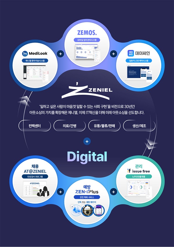 특히 제니엘은 자체 개발한 IT 솔루션을 통해 아웃소싱 업계의 혁신을 선도한다. 대표적으로 ▲AI 기반 안전사고 예방 서비스 ‘ZEN-i Plus’ ▲모바일 일용직 전자 근로계약 솔루션 ‘데이싸인’ ▲병원 최적화 환자이송시스템 ‘MediLook’ 등을 운영 중이다. 또한 ▲인성검사 프로그램 ‘AT@ZENIEL’ ▲모바일 업무관리 시스템 ‘ZEMOS’ ▲노무·안전 이슈 관리 플랫폼 ‘issue free’ ▲해외 IT 인력 매칭 서비스인 ‘IT 오프쇼어링’까지 갖췄다.