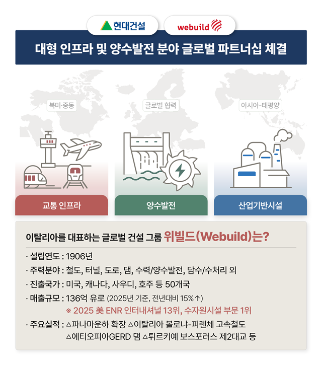 위빌드는 초대형 복합 엔지니어링 프로젝트를 전문으로 하는 글로벌 톱티어 건설기업으로 철도, 터널, 댐, 수력 및 양수발전 분야에 주력한다. 이탈리아를 포함한 유럽, 북미, 호주 등 선진시장에서 높은 점유율을 기록하고 있으며 2025년 미국 ENR 인터내셔널 건설사 최상위권, 특히 댐 및 저수지 등 수자원 부문의 1위를 차지한 바 있다.
