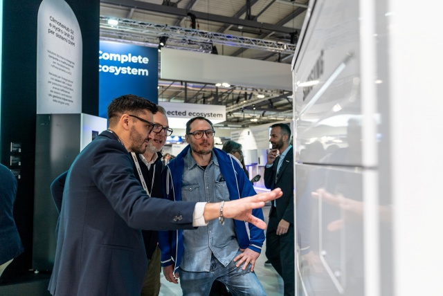 24~27일 이탈리아 밀라노에서 열린 ‘MCE 2026’에서 삼성전자 직원이 참석자들에게 DVM S2 R32의 특장점을 소개하고 있다. /삼성전자 제공