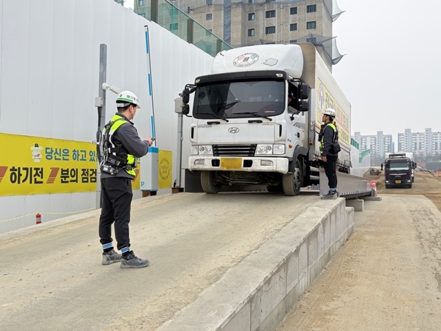 IPARK현대산업개발 관계자가 천안 아이파크시티 1단지에서 건설 자재 운반 차량의 중량을 측정하고 있다. /IPARK현대산업개발 제공