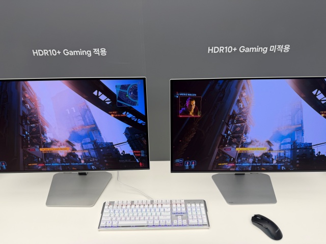15일 행사에서 공개된 ‘HDR10+ Gaming’ 기술 적용 비교 화면. 왼쪽 적용 화면에서 건물의 숫자와 윤곽이 더욱 선명하게 표현된 모습을 확인할 수 있다. /디지틀조선TV 임윤서 기자