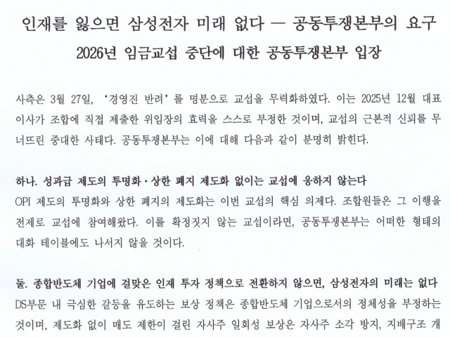 지난달 31일 삼성전자 노동조합 공동투쟁본부가 공개한 입장문 가운데 일부.