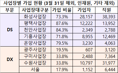 초기업노동조합 삼성전자 지부가 지난달 31일 공개한 사업장별 가입 현황.