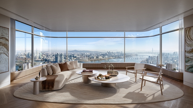 우선 삼성물산은 조합원 전 세대 한강 조망과 함께 '끊김 없는 한강 조망'을 실현한 외관과 창호 설계를 제안했다. 포스터 앤드 파트너스의 조망 분석 솔루션(CYCLOPS)을 통해 최적의 주동 배치를 도출했으며, 저층부에서도 막힘없이 한강을 누릴 수 있도록 최대 15m 높이의 하이 필로티를 적용했다. 여기에 거실 기둥을 없애면서 프레임 없는 광폭 창호를 적용한 '라운드 코너 아이맥스 윈도우'로 세대당 평균 20.5m에 달하는 270도 파노라마 한강 뷰를 제공한다.