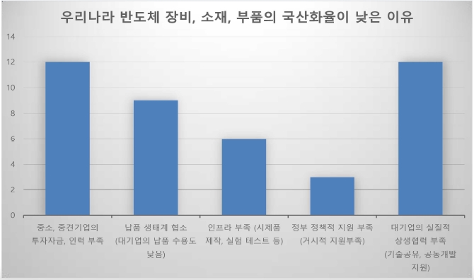 국내 반도체업계의 중견, 중소기업들은 한국이 반도체 장비·소재의 국산화율이 낮은 이유가 대기업의 실질적 상생협력이 부족하기 때문이라고 밝혔다. 4일 ..