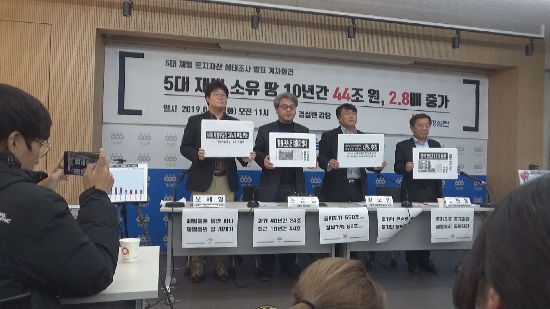 [앵커]현대차그룹과 삼성 등 국내 5대 재벌이 소유한 땅값이 지난 10년 동안 2.8배 증가한 것으로 나타났습니다. 경실련은 최근 2007년부터 201..